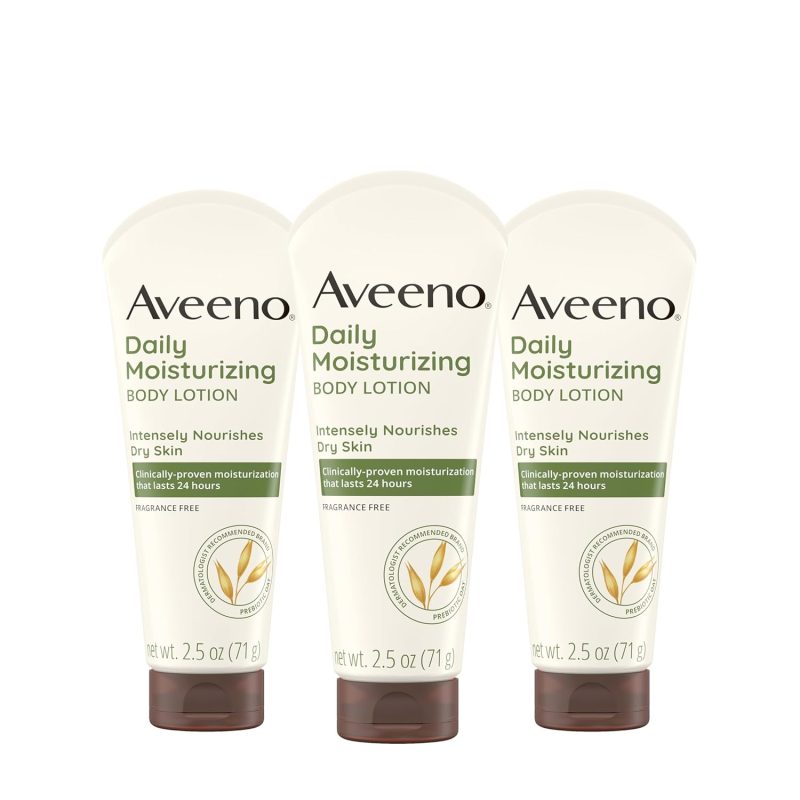 - Moisturizing body lotion: Value pack of three, 2.5-fluid ounce travel sized bottles of Aveeno Daily Moisturizing Fragrance Free Body Lotion for men & women to instantly strengthen the skin barrier with 48-hour moisturization