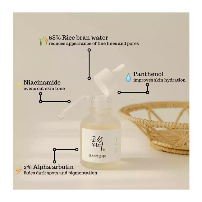 - Key Ingredients: Rice Water 68%: Moisturizing, hydration and glowing. Alpha-Albutin 2%: Radiance, dark spots, skin protection and pigmentation. Niacinamide: Skin tone, skin barrier and acne care.