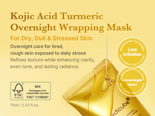- Proven Results -Clinical trials reveal remarkable improvements with medicube Kojic Acid Turmeric Night Wrapping Mask: +6.8% enhancement in skin texture after single use, 24.7% improvement in uneven skin tone after 3 days of use and +33% increase in skin radiance after a single application. *Clinical Trial Tested by the 'Cutisd Life Science Research Center.' / Results may vary depending on individual skin types