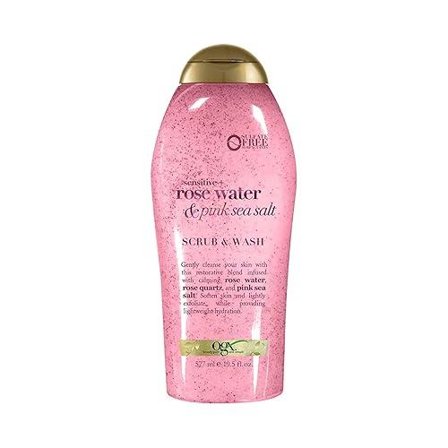 OGX Sensitive + Rose Water & Pink Sea Salt Exfoliating Body Scrub + Rose Quartz, Gentle Exfoliating Daily Body Wash Softens Skin, Body Scrub for Women, Sulfate-Free Surfactants, 19.5 fl oz